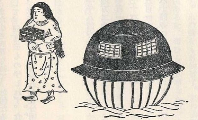 There are two versions of this story. One was written in 1825 and one in 1844. In both versions, some Japanese sailors happened to notice, floating in the ocean, a very strange vessel. It was circular, which was not so unusual. What caught there attention was that it seemed to have a lid that covered the top of the ship, and glass windows.