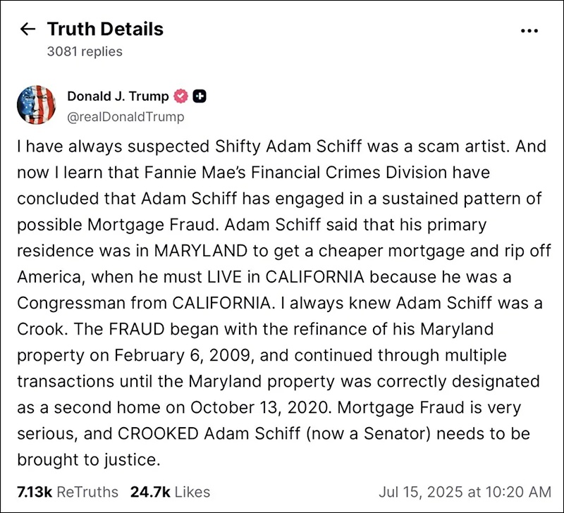 The confrontation comes as Schiff is reportedly under Justice Department investigation for committing mortgage fraud, as President Donald Trump has urged his attorney general to turn up the heat on him, after labeling him a “scam artist” following Fannie Mae’s Financial Crimes Division reportedly accusing Schiff of fraud.