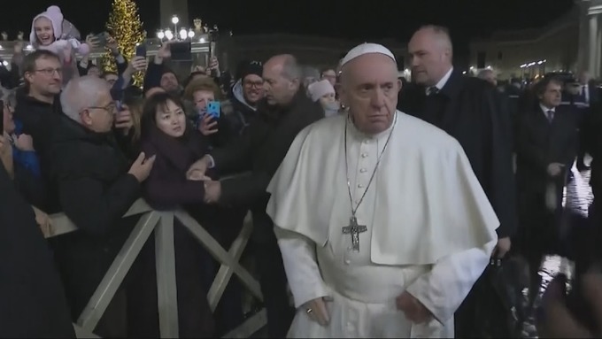 After slapping her hand several times, the Pope freed himself of her grip. The usually serene Francis scowled as he walked away.