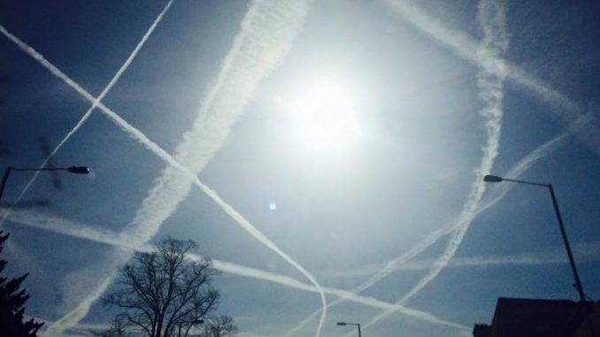 Whether you think the cloudy white streams are contrails (i.e. condensation trails from planes) or chemtrails (chemicals being deliberately sprayed), you have to admit that it IS looking a bit weird.