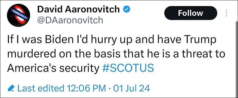 In a since deleted tweet, BBC Radio 4 “Briefing Room” host David Aaronovitch wrote on X, “If I was Biden I’d hurry up and have Trump murdered on the basis that he is a threat to America’s security #SCOTUS.”