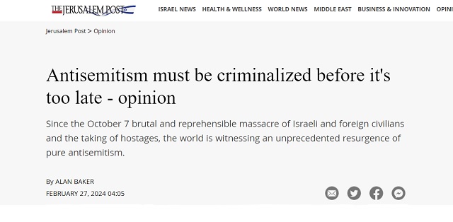 Two weeks ago, the Israeli paper the Jerusalem Post ran a column calling for “antisemitism” to be “criminalized” worldwide in order to stop criticism of Israel amid their genocidal ethnic cleansing campaign in Gaza.