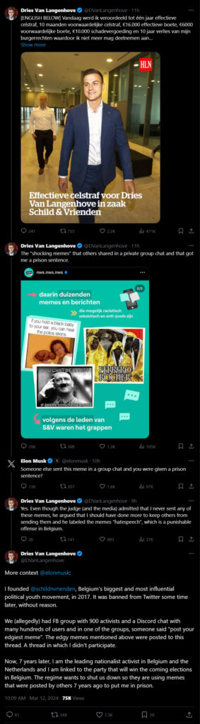“Belgian nationalist activist and former member of parliament Dries Van Langenhove has just been sentenced to a year in prison, a 16,000 euro fine, and ten years of ‘deprived civil rights’ which will mean he is barred from politics,” Keith Woods reported on X.