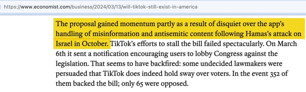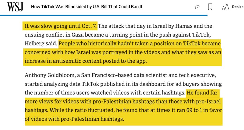 [Rep. Mike Gallagher’s (R-WI)] efforts [to ban TikTok] appeared to stall in 2023, but were revived in part by the fallout from the Oct. 7 attack by Hamas on Israel, according to people close to TikTok and people close to lawmakers. TikTok’s users quickly inundated the platform with videos about the attack and Israel’s war on Gaza. Some lawmakers said TikTok appeared to favor pro-Palestinian and anti-Israel content, and renewed calls to ban the app in the U.S.