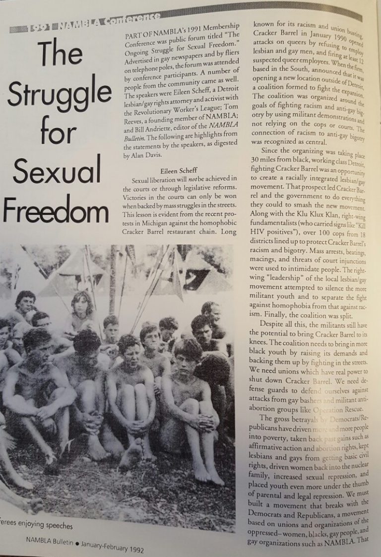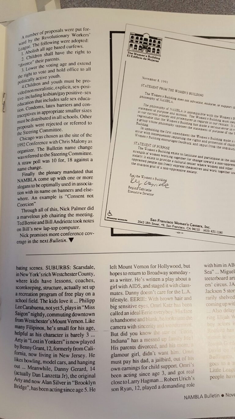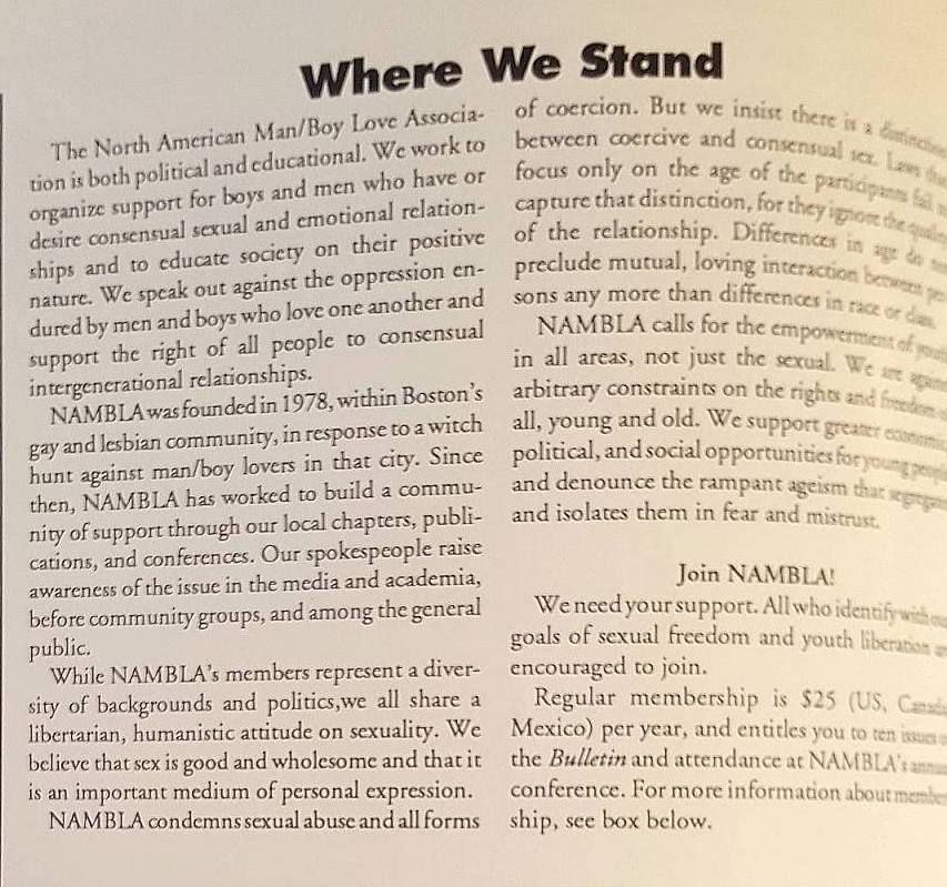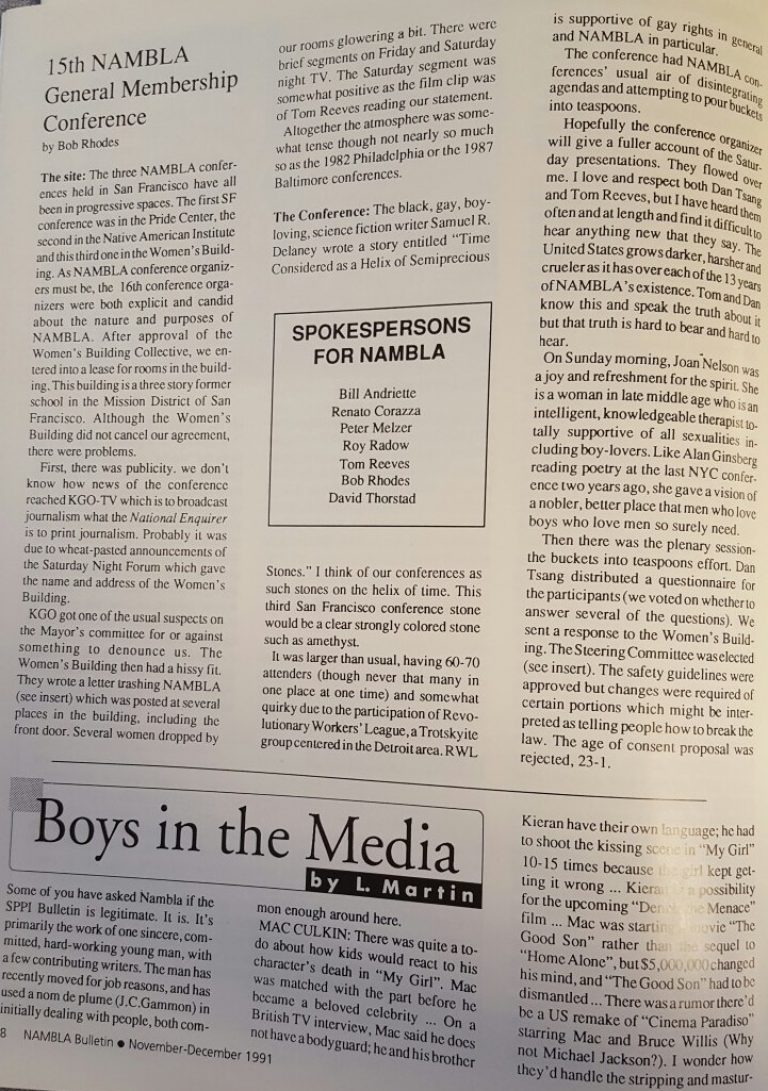 The 1992 edition of the pro-pedophilia bulletin also noted the participation of RWL, which was described as a “NAMBLA ally.”