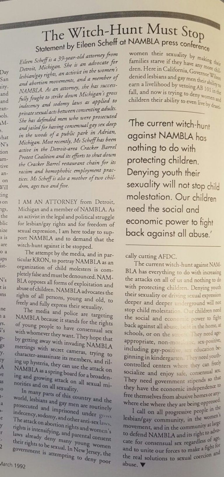 “I call on all progressive people in the lesbian/gay community, in the women’s movement, and in the community at large to defend NAMBLA and its right to advocate for consensual sex regardless of age, and to unite our forces to make a fight for the real solutions to sexual coercion and abuse,” Scheff said.