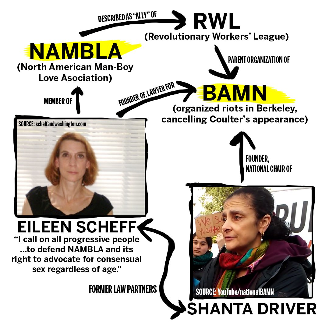 Driver’s former law partner, Eileen Scheff — who has represented BAMN on multiple occasions, including at the Supreme Court — has been a self-described “member of NAMBLA.” The bulletin identified Scheff as an RWL member.