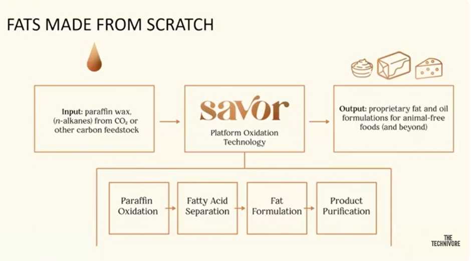 However, we were able to find some details about their process in a presentation given at the Good Food Institute conference held in September 2023. In a session titled ‘Commercial innovation of alternative fat ingredients’, Savor’s Director of Business Development Chiara Cecchini presented the diagram below to show the process they use to make the synthetic fats that they want us to eat.