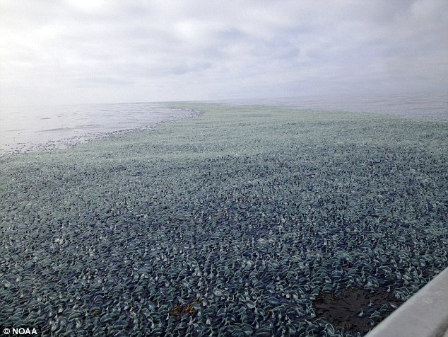 The jelly-fish-like creatures each measure around seven to 10 centimetres, are bright blue and distinguished by a gas-filled float that rises above the surface of the water.