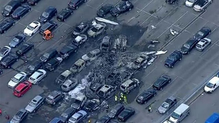 It then collided with several parked cars 70 metres beyond the bank where the wings detached from the fuselage and the plane burst into flames.