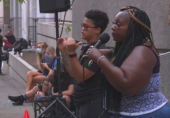 A Black Lives Matter leader in Portland whipped a baying crowd into a frenzy while proclaiming that police officers should be hung and electrocuted “like a piece of burnt bacon” and fantasizing about babies being strangled to death with their umbilical cords.