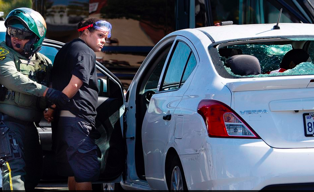 A Black Lives Matter leader has been arrested and charged with attempted murder and assault with a deadly weapon after video showed her accelerating her car into a crowd of Trump supporters in southern California, injuring two.