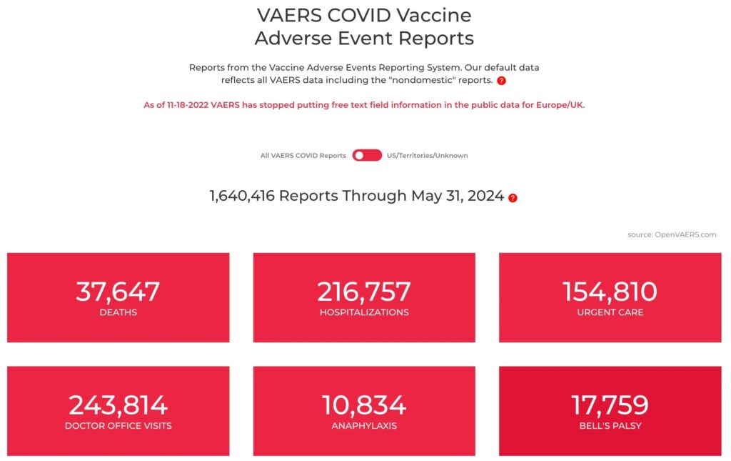 According to the VAERS COVID Adverse Event Reports that track all of the COVID-reported vaccine deaths and complications, 37,647 people have died from the COVID-19 vaccine – as of May 31, 2024.