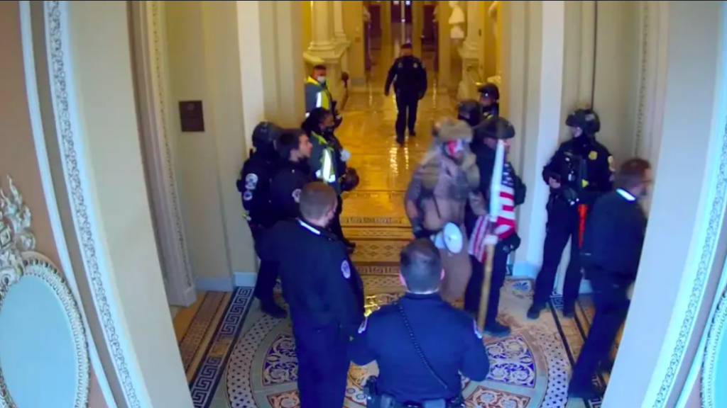 The footage, which Democrats have been working to keep hidden from the public for years, shows two Capitol Police officers escorting Jacob Chansley, the behorned “QAnon Shaman” who has come to symbolize the riot, through the halls of the Capitol and to the very door of the US Senate.
