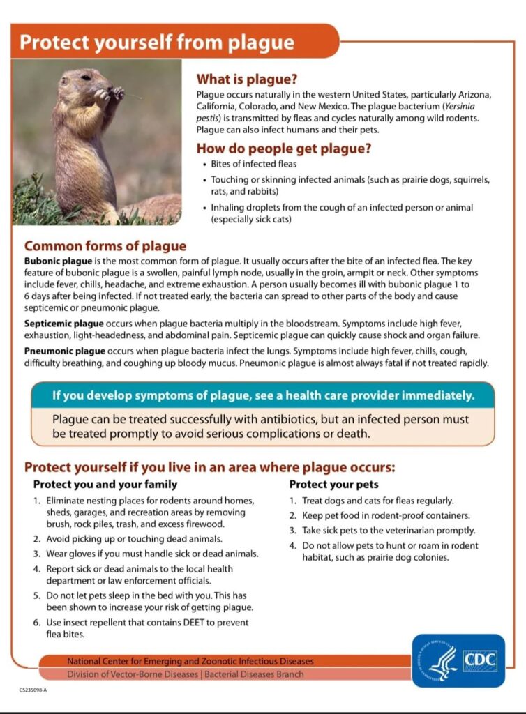 According to the CDC, “Humans usually become infected through the bite of an infected rodent flea or by handling an infected animal. Plague can be cured with antibiotics, but these must be given promptly to prevent serious illness or death.”