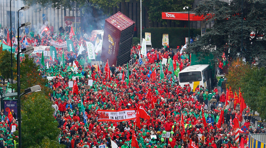 The rally was staged by the country’s three largest unions, who spoke out against austerity and accused Prime Minister Charles Michel of promoting big companies at the expense of the workforce.