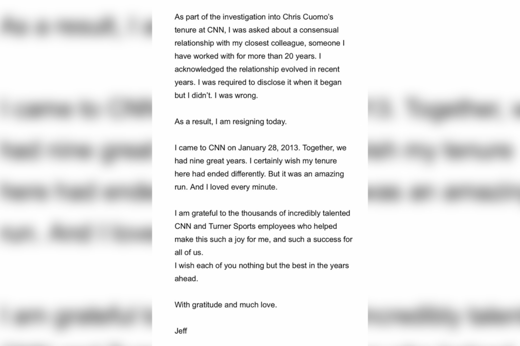 “As part of the investigation into Chris Cuomo’s tenure at CNN, I was asked about a consensual relationship with my closest colleague, someone I have worked with for more than 20 years,” Zucker wrote.