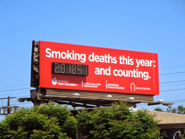 Cruising down Santa Monica Boulevard in West L.A. provides commuters with a lovely view of the famously grim smoking death counter billboard seen above. We are being scaremongered daily by anti-smoking ads through our media. And because of such efforts, the percentage of smokers in the Western world has greatly decreased, but yet, sales on tobacco products are more profitable that ever!