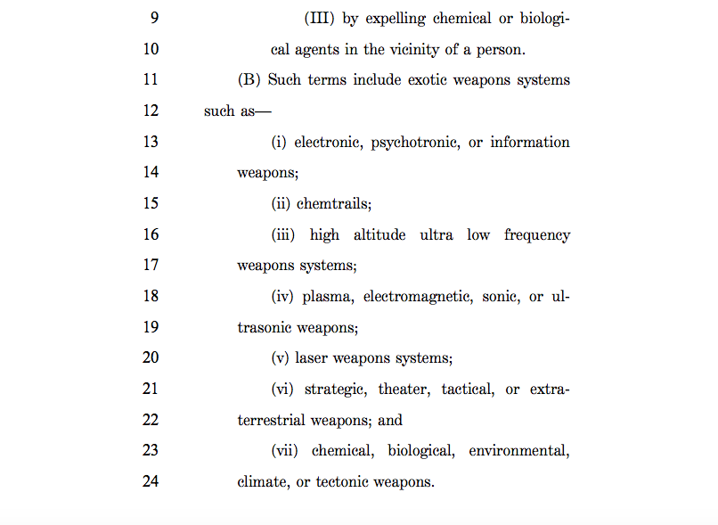 This bill contains admissions of the existence of; electronic, psychotronic, or information weapons; chemtrails; high altitude ultra low frequency weapons systems; plasma, electromagnetic, sonic, or ultrasonic weapons; laser weapons systems; strategic, theater, tactical, or extra terrestrial weapons; and chemical, biological, environmental, climate, or tectonic weapons.