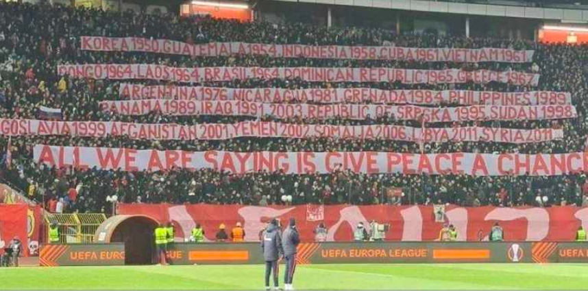 Serbian soccer fans exposed decades of NATO hypocrisy on Thursday, holding aloft a series of giant banners listing every single NATO military intervention, and finishing with the message “All we are saying is give peace a chance.”