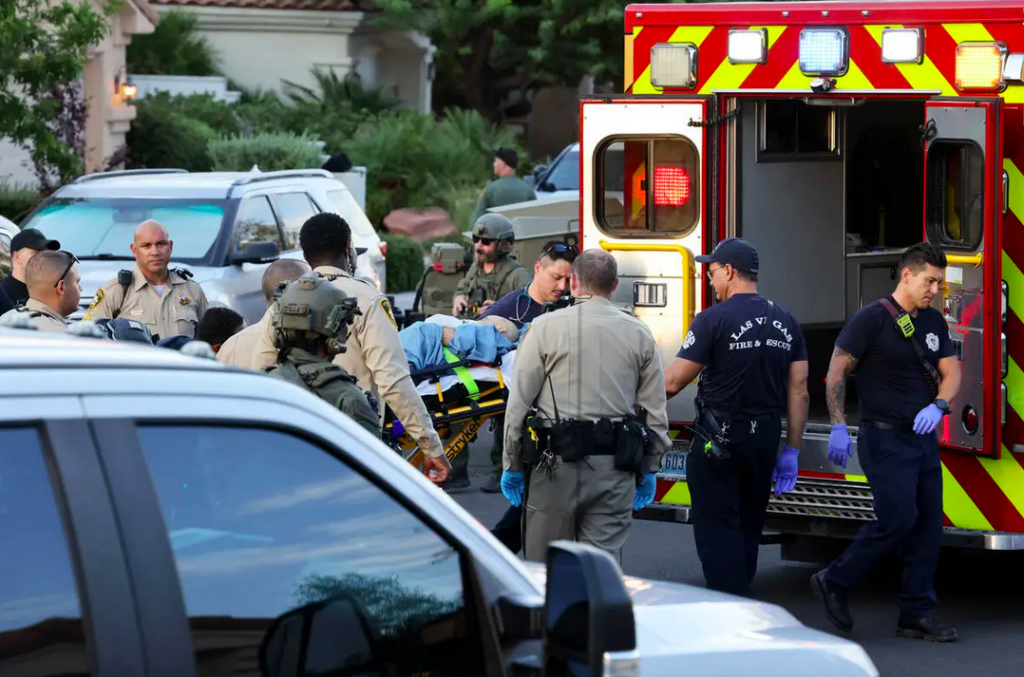 They provided no further information until Clark County Sheriff Joe Lombardo told the Review-Journal at around 6:30 p.m. that Telles had been arrested. Shortly before that, a Review-Journal photographer captured an image of Telles on a stretcher as he was loaded into an ambulance. Las Vegas Review-Journal reports: