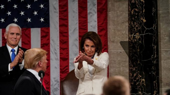 After Trump called on the country to “embrace the boundless potential of cooperation, compromise and the common good,” Democratic Speaker of the House Nancy Pelosi, sitting behind the president, fired off a few sarcasm-dipped golf claps. The acerbic salute caused a sensation on social media, with photos of Trump and Pelosi locking eyes as she offers her feigned applause being hailed as epoch-defining treasures.