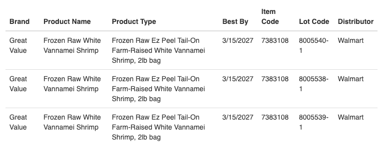 • Great Value brand frozen raw shrimp, lot code: 8005539-1, Best by Date: 3/15/2027.