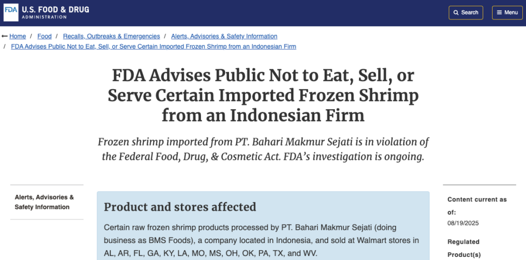 “If you have recently purchased raw frozen shrimp from Walmart that matches this description, throw it away. Do not eat or serve this product,” the FDA states.