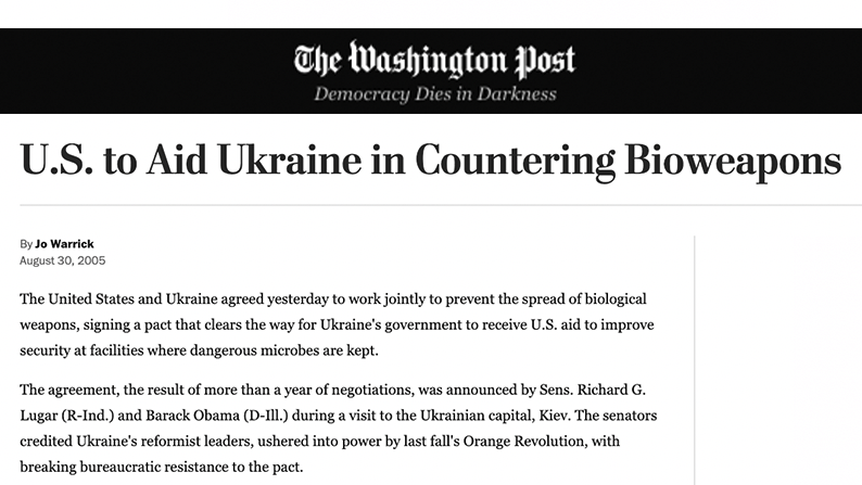 However, a 2005 article by the same outlet titled, “U.S. to Aid Ukraine in Countering Bioweapons,” stated, “The United States and Ukraine agreed yesterday to work jointly to prevent the spread of biological weapons, signing a pact that clears the way for Ukraine’s government to receive U.S. aid to improve security at facilities where dangerous microbes are kept.“