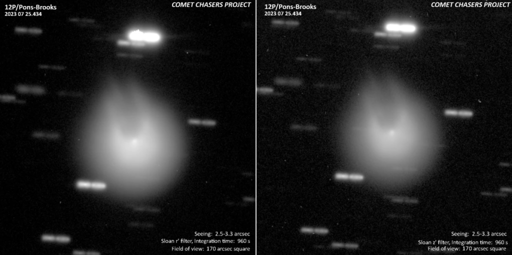 This is the second time 12P has sprouted its horns this year. On July 20, astronomers witnessed the comet blow its top for the first time in 69 years (mainly due to its outbursts being less frequent and harder to spot during the rest of its orbit). On that occasion, 12P’s coma grew to around 143,000 miles (230,000 km), which is around 7,000 times wider than the comet’s nucleus.