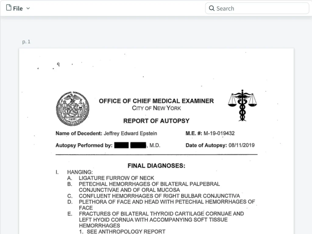 A redacted version of Epstein’s post mortem examination was released in December as part of the justice department’s first release of the so-called Epstein files.
