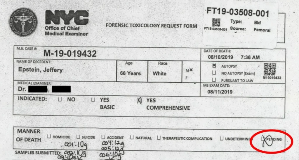 In it, the child sex offender’s “manner of death” is marked as “pending”. Boxes for both suicide and homicide are left blank.