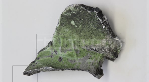 Other metal particles are due to the Boeing-MH17. Here we see that red-hot metal particles craters have beaten in a piece of fuselage. Deep in one of those craters are still remnants of artificial insulation, a kind of wool that can withstand very high temperatures.