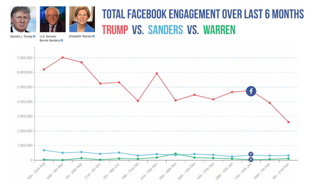 It is important to note that while Sanders and Warren could have also seen a decline in engagements, the impact would not be comparable because they already had fairly low engagements when compared to Trump.