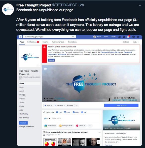 UPDATE: Free Thought Project @TFTPROJECT now gone from both Facebook and Twitter as well. There's definitely some kind of coordination or overlap going on behind the scenes between the two platforms.
