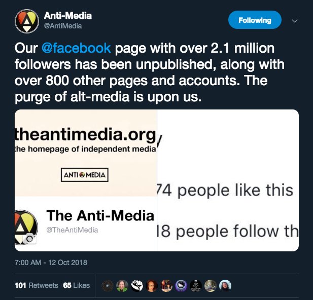 Antiwar critics of establishment politics @AntiMedia and @TFTPROJECT just had their pages with millions of followers deleted by Facebook, along with hundreds of other alternative media outlets. Latest escalation of corporate censorship used as state censorship in the west. pic.twitter.com/Fdk9Yd13jI