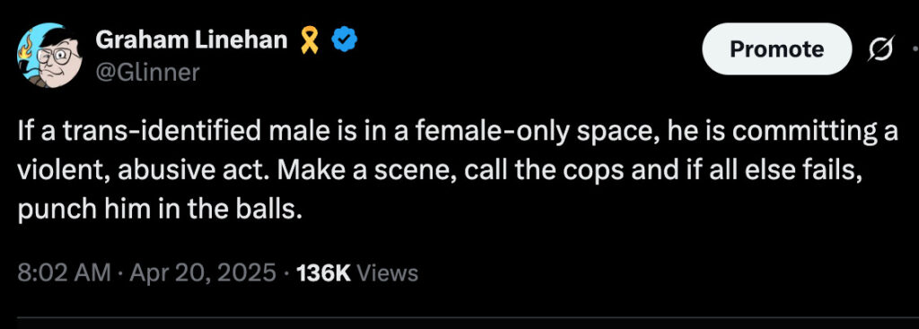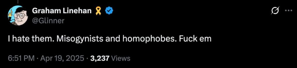 The gender-critical campaigner leapt to Linehan’s defence just weeks after he accused her of failing to back him after he was cancelled over his similar views.