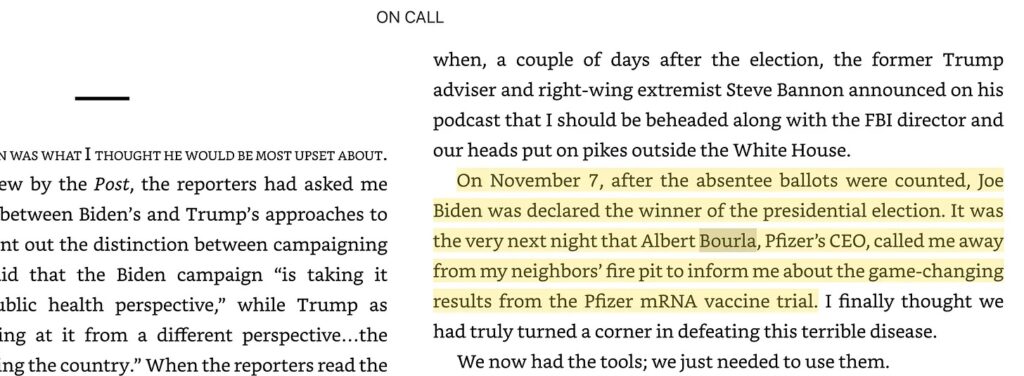 In his new book, “On Call,” Fauci admits that Albert Bourla, the CEO of Pfizer, called him the night after Biden was declared the winner of the election, to inform him of Pfizer’s “game-changing results” from the rigged mRNA trial.