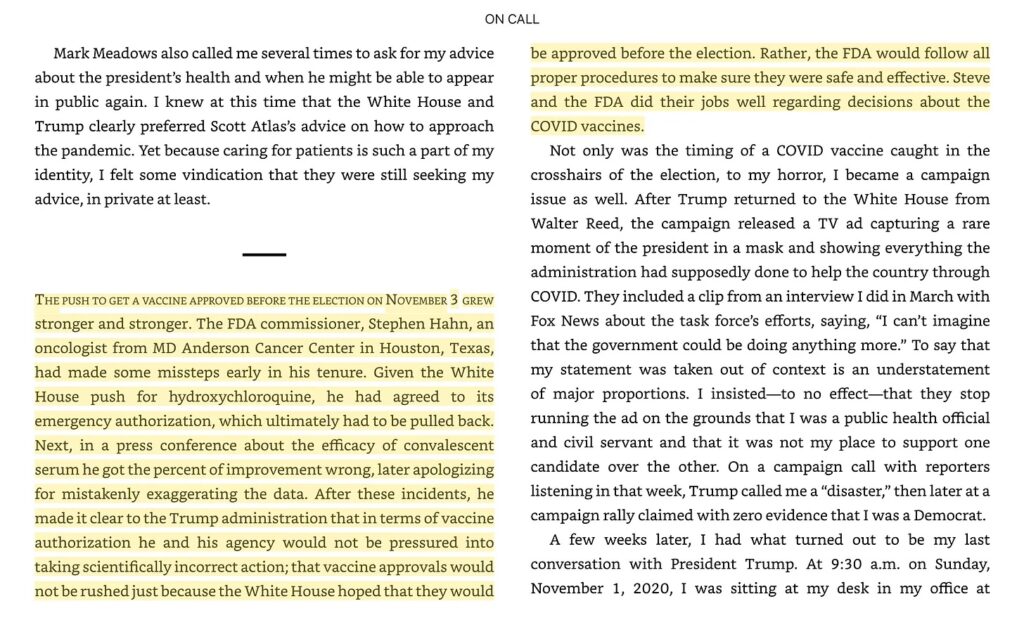 Fauci says that Hahn “made it clear to the Trump administration that in terms of vaccine authorization he and his agency would not be pressured into taking scientifically inorrect action,” adding that “vaccine approvals would not be rushed just because the White House hoped that they would be approved before the election.”