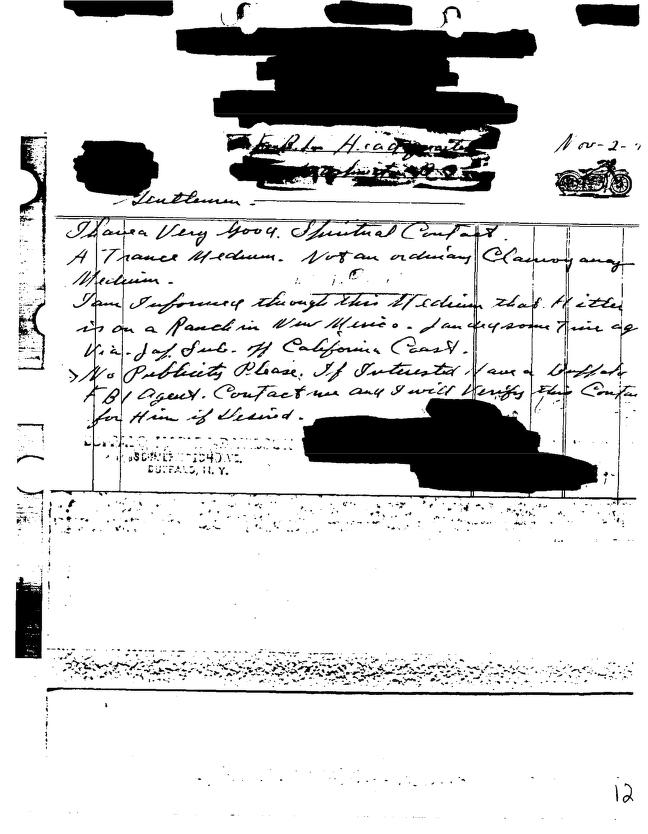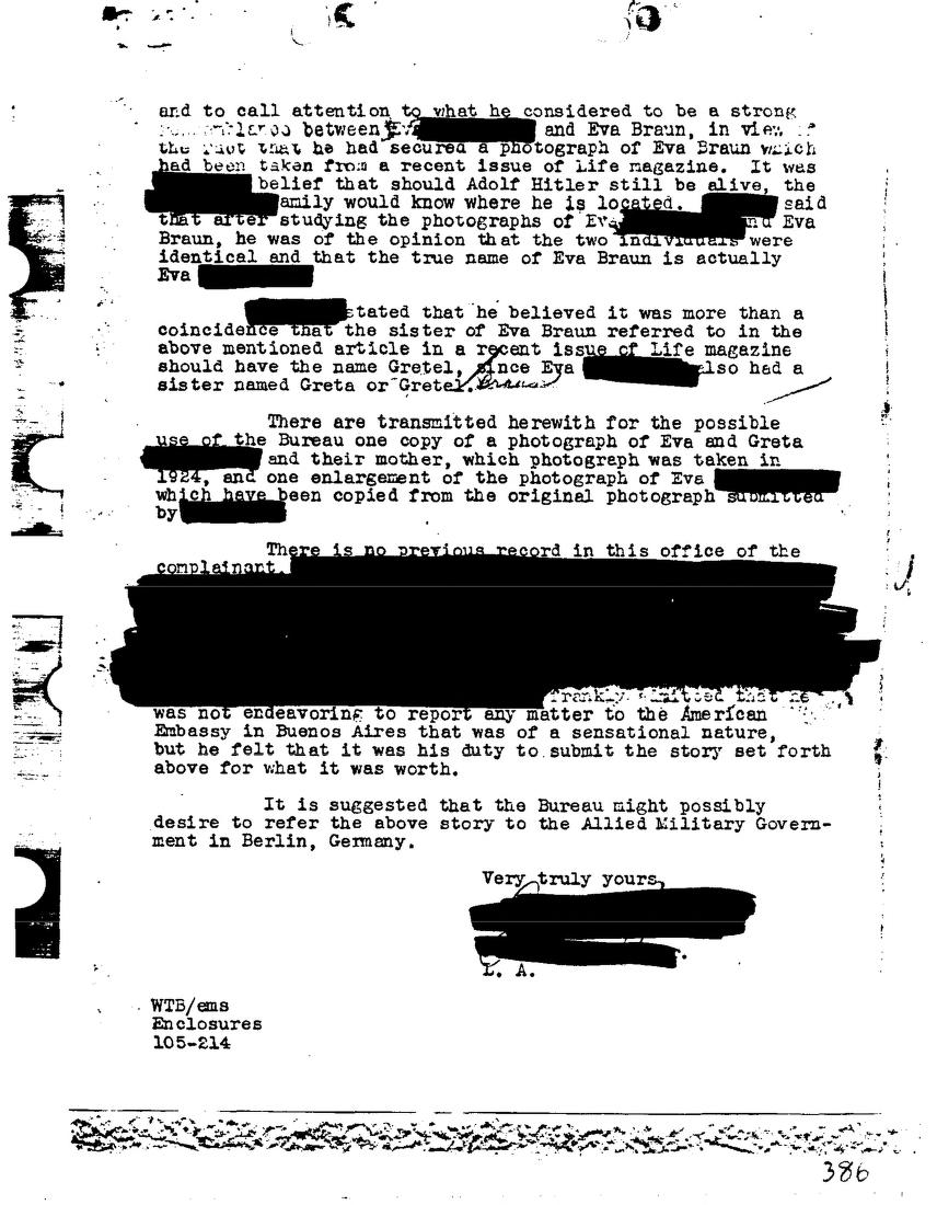 Apparently, two submarines had landed on the Argentinian coast, and Hitler with Eva Braun was on board the second. The Argentinian government not only welcomed the former German dictator, but also aided in his hiding. The informant went on to not only give detailed directions to the villages that Hitler and his party had passed through, but also credible physical details concerning Hitler. While for obvious reasons the informant is never named in the FBI papers, he was credible enough to be believed by some agents.