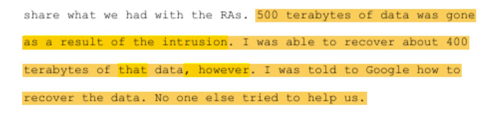 Spivack stated that “500 terabytes of data was gone as a result of the intrusion,” but approximately 400 terabytes were later recovered, leaving about 100 terabytes irretrievable—a massive volume equivalent to millions of files, potentially including forensic images, videos, documents, and other investigative materials from child exploitation and related cases.