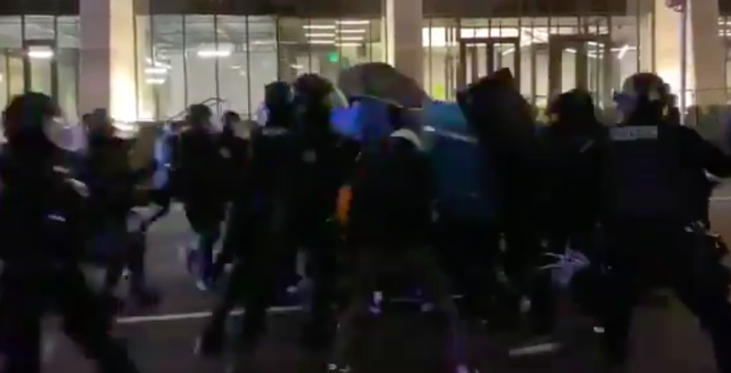 So it shouldn’t come as a surprise that the cops have decided to change their tactics and made minced-meat of one group of far-left militants who formed a “line” in the street, with their make-shift shields.