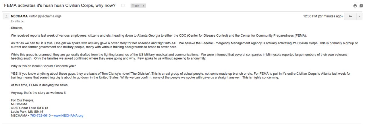 The Daily Sheeple received an email with the subject line, “FEMA activates it’s hush hush Civilian Corps, why now?”