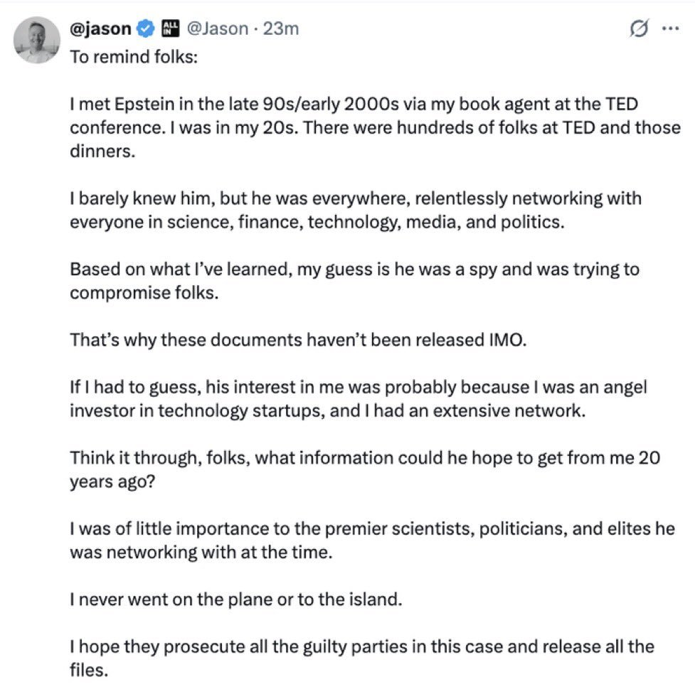 Emails also show Epstein courting tech moguls like Jason Calacanis (Uber investor, podcaster), who in 2011 called him “pal” and offered contacts despite later claiming minimal ties from the early 2000s. Calacanis speculated Epstein was a “spy” trying to “compromise” people, yet aided his networking.