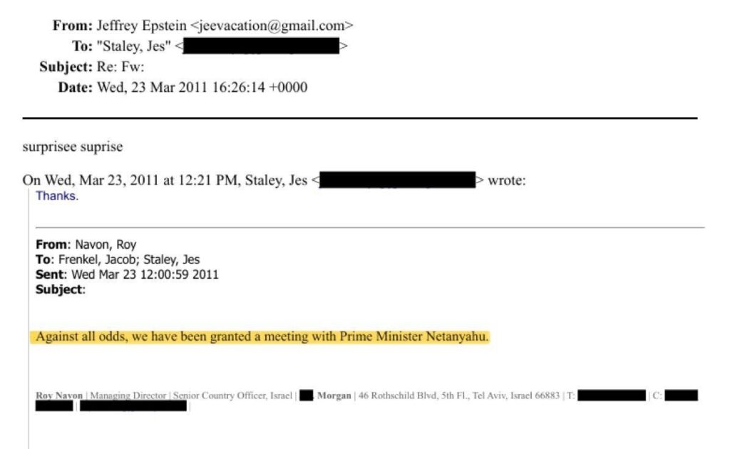 New files also reveal Epstein coordinating a meeting with current Israeli Prime Minister Benjamin Netanyahu, involving Barclays CEO Jes Staley (later ousted over Epstein links) and investor Jacob Frenkel.