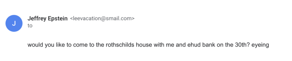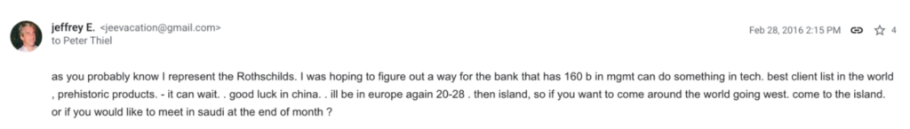 A 2016 email to Palantir co-founder Peter Thiel states that Epstein “represent[s] the Rothschilds” and proposes involving their bank (with $160 billion under management at the time) in tech investments. Thiel responds by suggesting a meeting in New York or “on island” (likely referring to Epstein’s notorious Little St. James in the United States Virgin Islands).