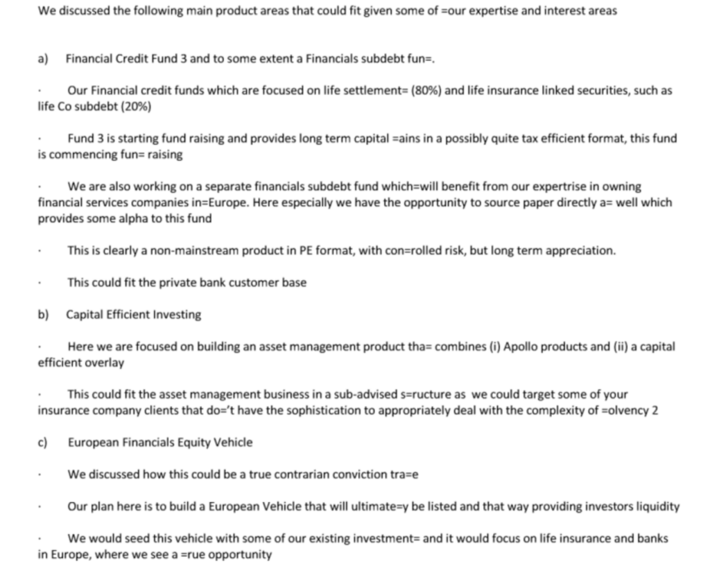Additionally, a forwarded 2016 email chain received by Epstein from Marc Rowan of Apollo Global Management details follow-up discussions between Apollo’s Gernot Lohr and Cynthia Tobiano (CFO of Edmond de Rothschild) on potential cooperation in financial products, including life settlements funds, capital-efficient investing for insurance clients, and a European financials equity vehicle.