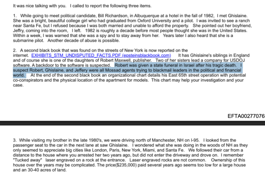 “I suspect Robert, Ghislaine, and Jeffery were all Mossad agents trying to blackmail leaders in the political and financial world,” Iverson wrote.