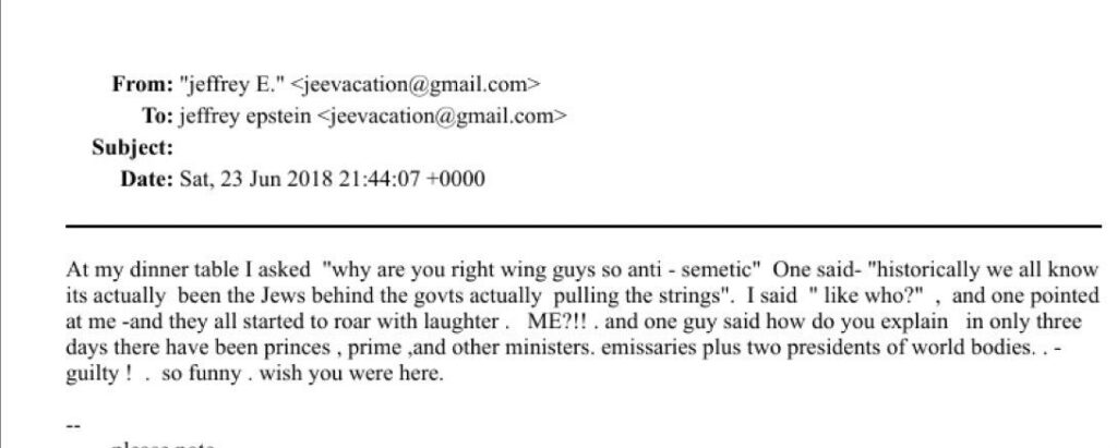 In a 2018 self-addressed email, Epstein recounts a dinner conversation in which he jokingly engaged with claims of Jewish influence over governments, ending with laughter and the word “guilty!”