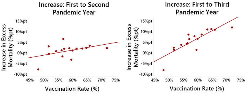 The groundbreaking study found that contrary to what would be expected with an effective vaccination, positive instead of negative correlations were observed: the more vaccinations were administered in a federal state, the greater the increase in excess mortality.